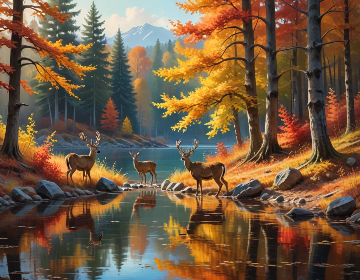 This image shows a serene autumn forest scene with a herd of deer drinking at the lake's edge, set against a backdrop of vibrant triadic colors and warm sunlight filtering through the trees.
