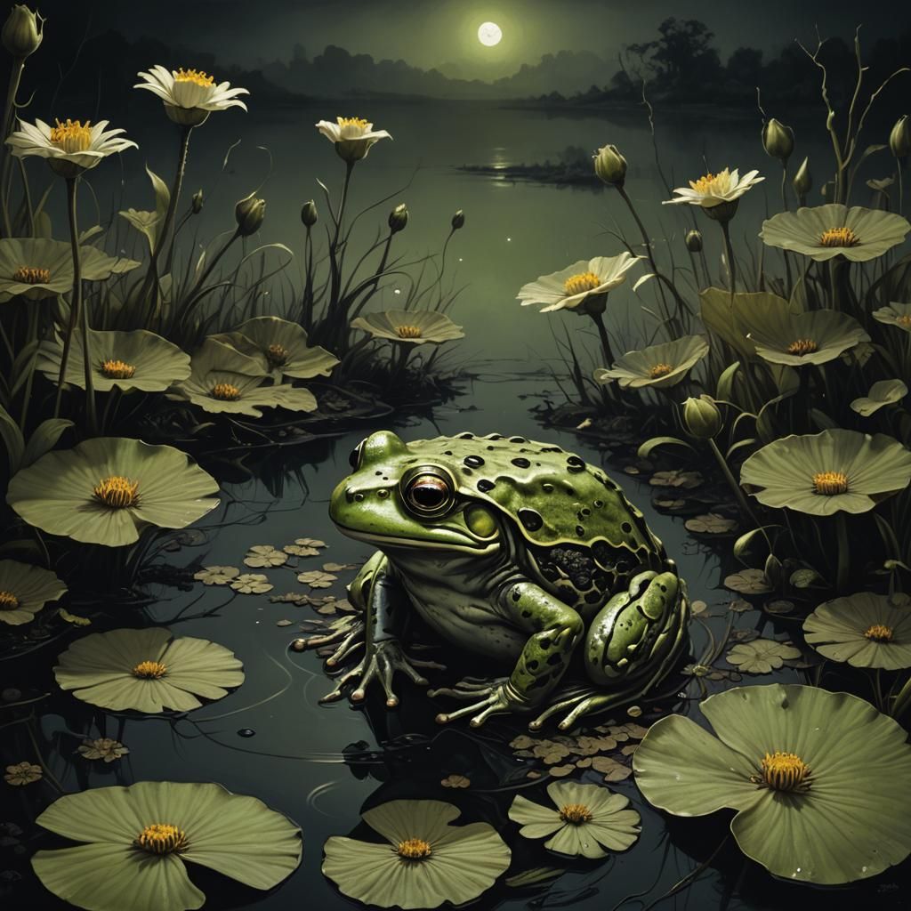 This image shows a green frog in a dark pond, surrounded by black marsh flowers. The image uses chiaroscuro techniques, bioluminescent lighting, and a muted color scheme to create a surreal, moody atmosphere.