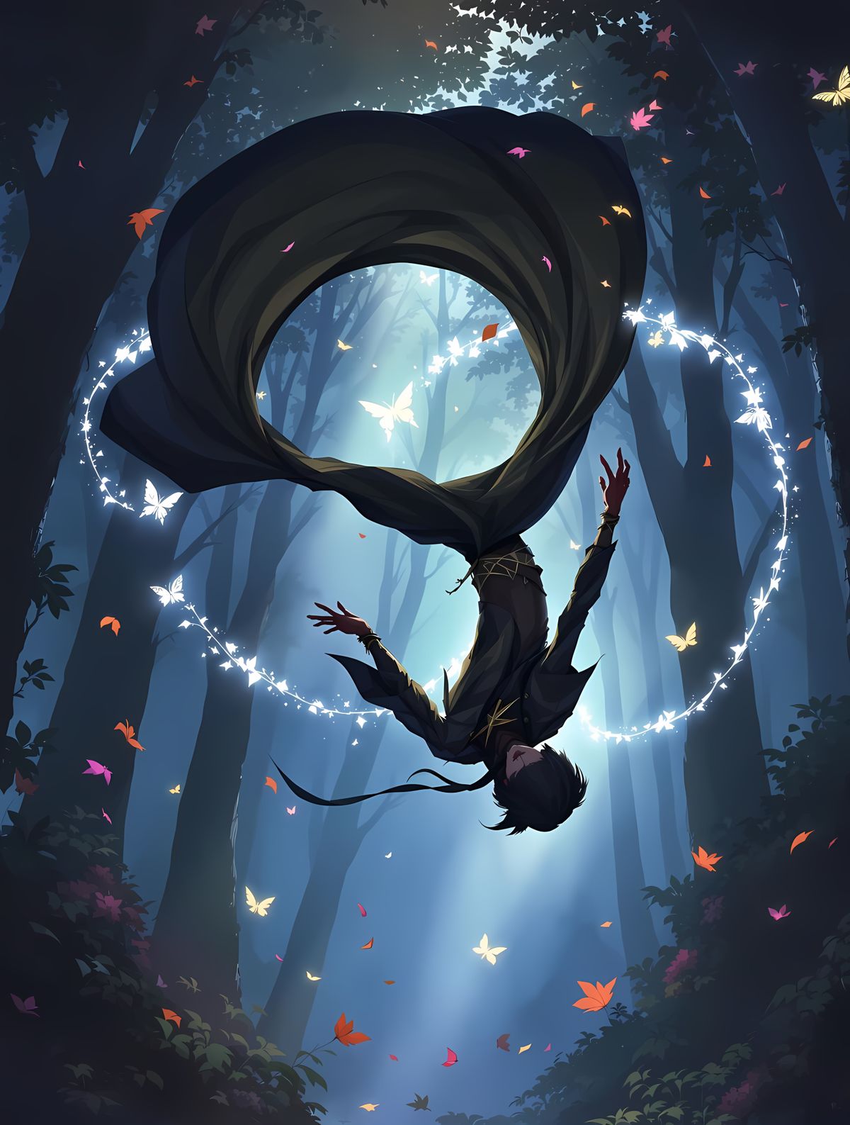 This captivating fantasy illustration captures a nimble rogue in mid-air, surrounded by a whirlwind of leaves and petals. A glowing butterfly flutters in their outstretched hand, as they balance with a dagger at the ready, set against a backdrop of a mystical forest illuminated by ethereal beams of light...
