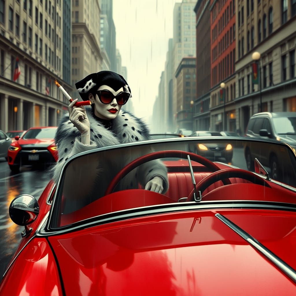 A digital artwork of a stylish Cruella de Vil driving a red Cadillac. The piece, set on a rainy city street, blends noir and Art Deco styles with a futuristic aesthetic.