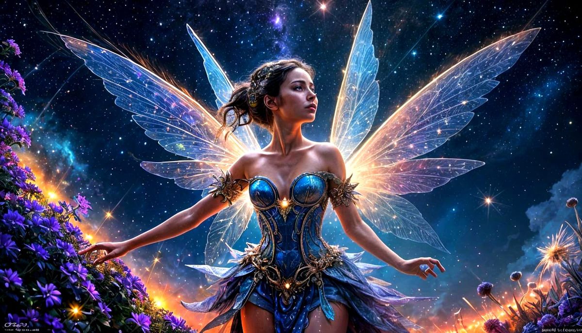 This image shows a cosmic fairy with wings of nebulae, hovering in a dying star. She scatters celestial seeds, rendered with intricate details and vibrant colors in a hyperrealistic style.