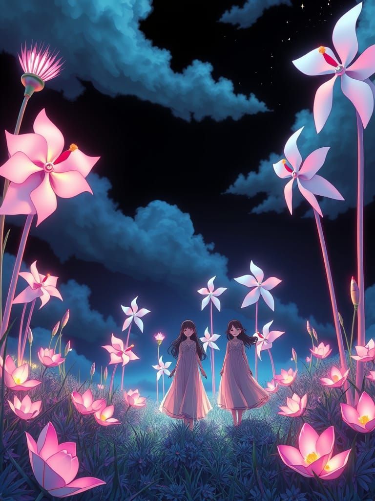 This image shows smiling girls in flowing dresses amidst a surreal landscape. Neon flowers, crystalline grasses, and giant pinwheels fill the scene, set against a deep black sky with bluish clouds as 3d rendered digital art.