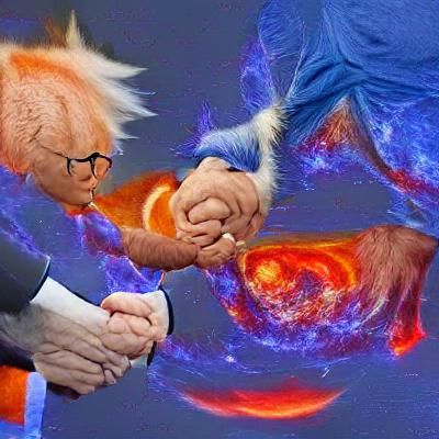 This image shows Goku and Bernie Sanders clasping hands amidst the chaos of the universe's creation. The scene is depicted with vibrant colors and cosmic energy.