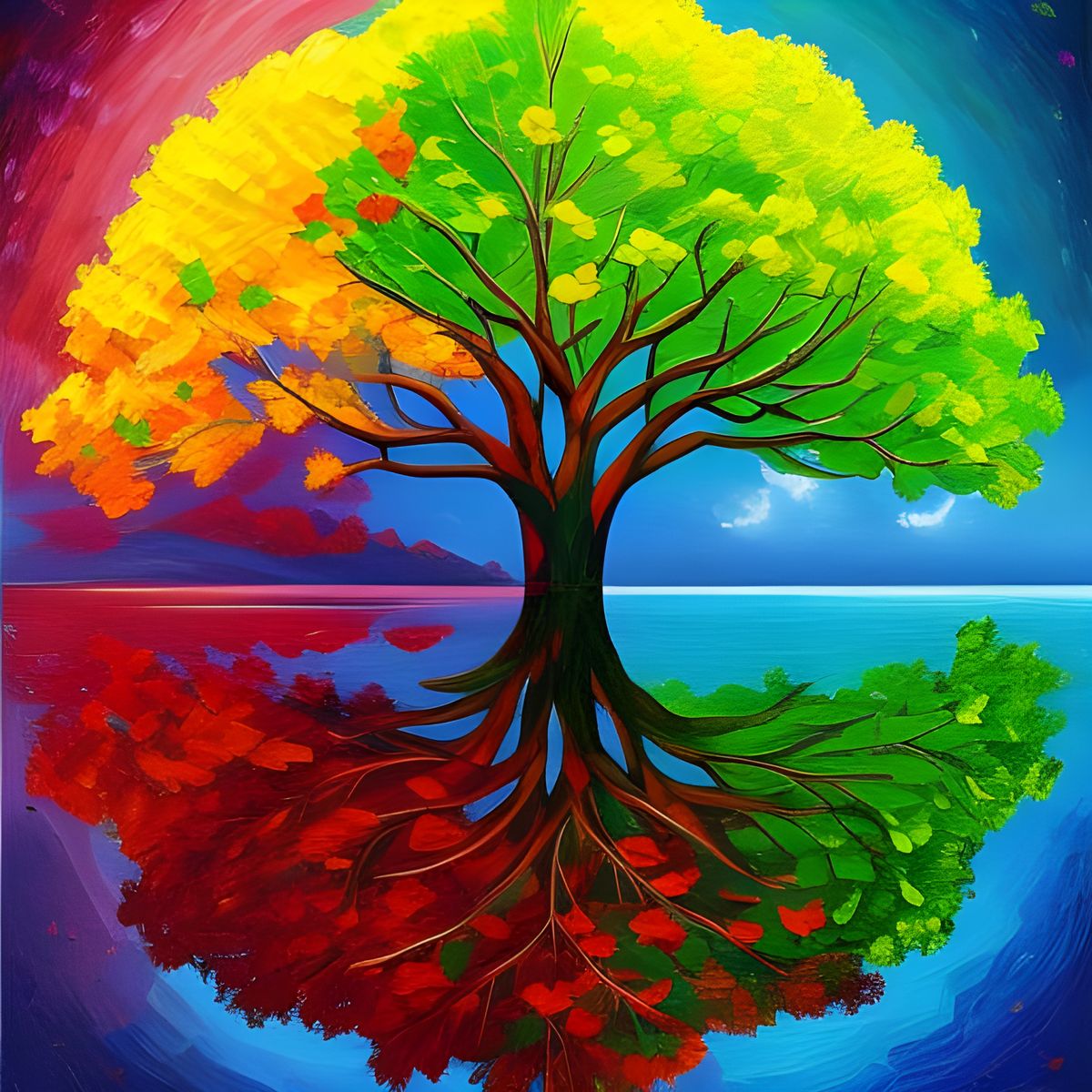 A vibrant isometric illustration showing a Tree of Life through the four seasons. The artwork features detailed concept art with textured strokes in an impressionistic style.