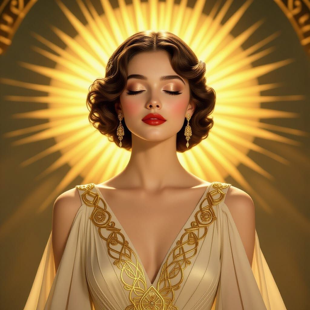 This image shows a serene Art Deco portrait of a woman in an ivory gown with gold embroidery. Features a radiant golden sunburst background with cinematic lighting, rendered with opulent textures.