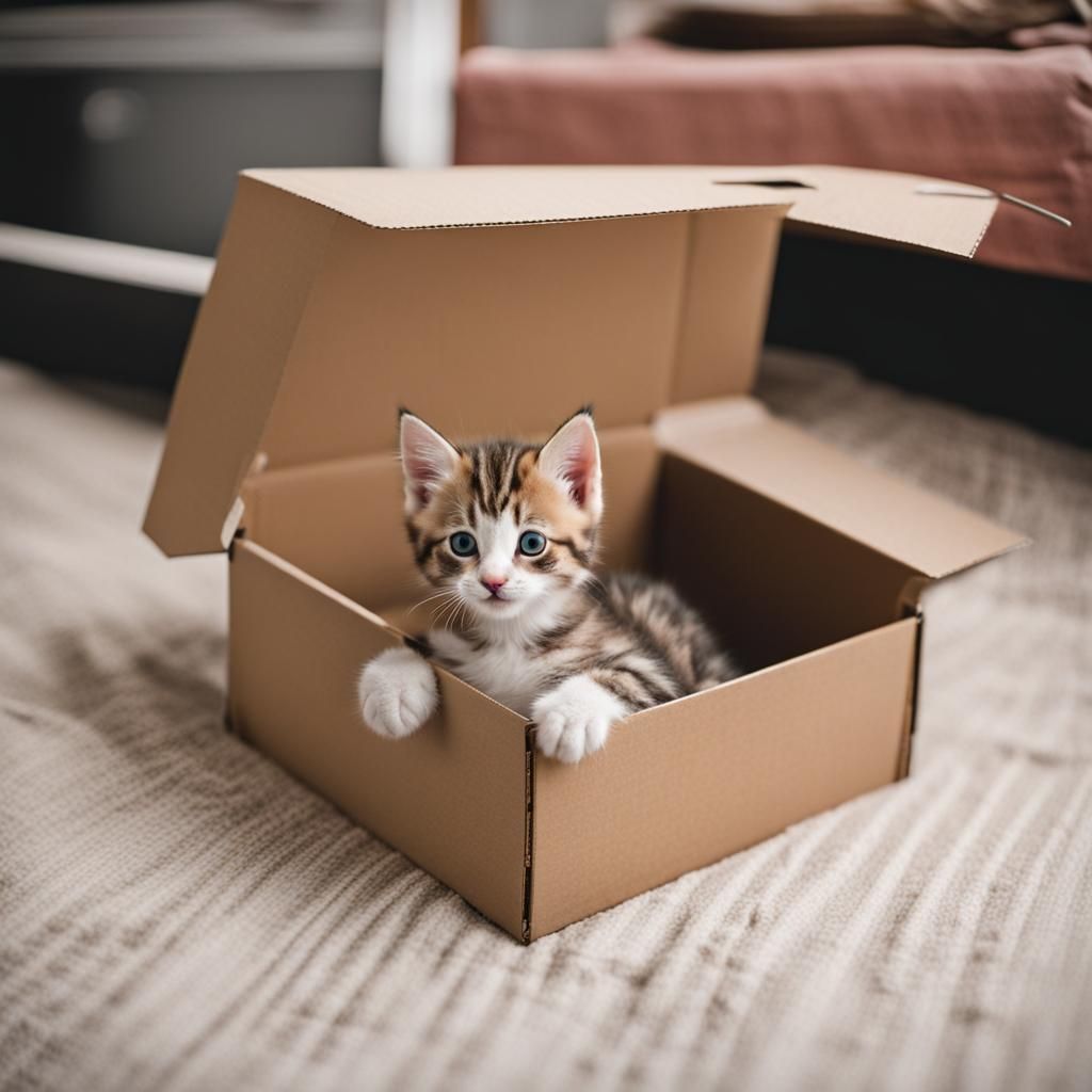 This image shows a cute kitten sitting inside a cardboard box. The simple composition focuses on the animal's curious expression and playful nature.