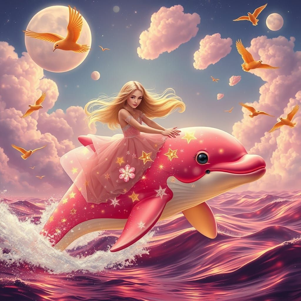 A vibrant image of a woman with golden hair riding a bioluminescent gummy dolphin through a cola sea. The fantasy scene features candy floss clouds and caramel-winged birds, rendered with pinks, purples, and golds.