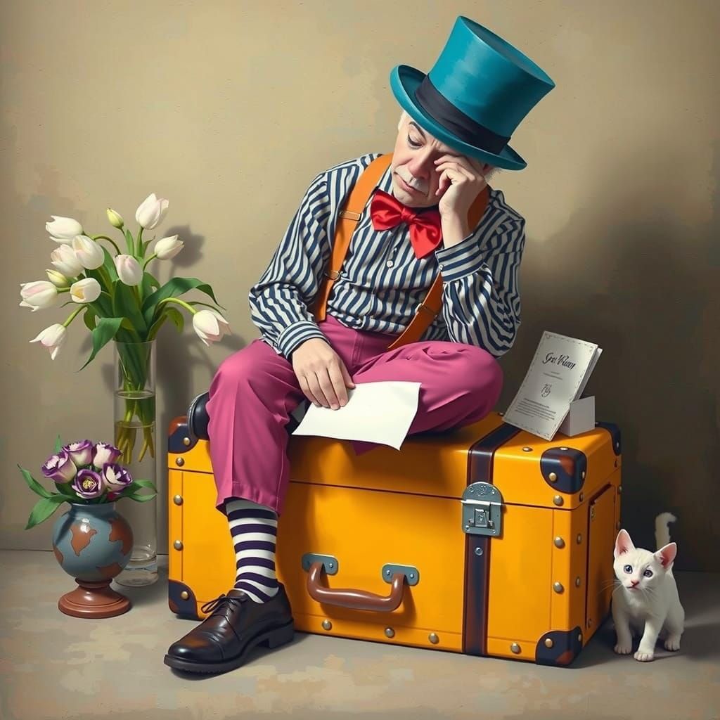 style of Leonid Afremov A contemplative sad clown sitting on a vintage yellow suitcase, slouched with his right elbow resting on his right knee, hand supporting his chin, and left hand holding an unfolded letter on his lap, wearing a teal top hat, striped shirt with suspenders, bright pink pants, red ...