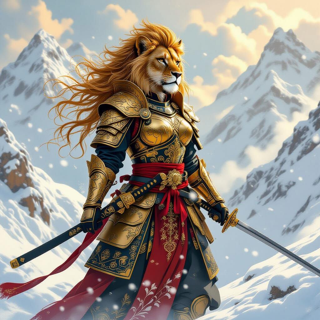A striking picture of a lioness samurai warrior in golden armor, standing on a snowy mountain. The image has vibrant colors, intricate textures, and long shadows in an art nouveau aesthetic.