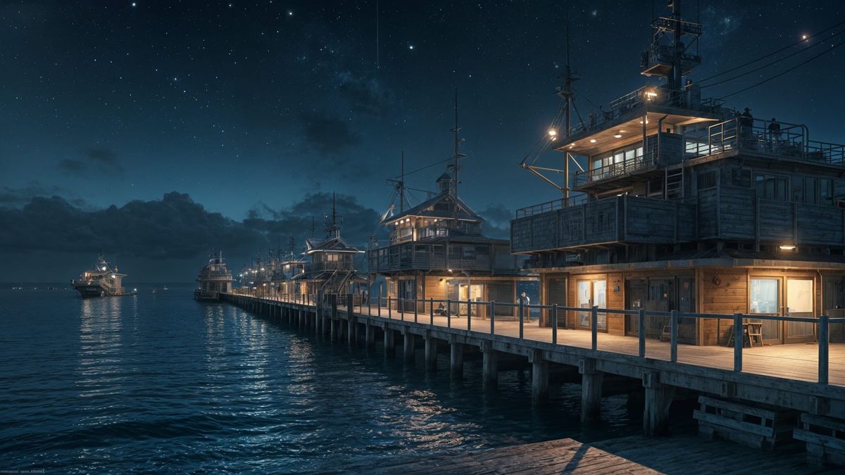 This image shows a detailed, 3D anime-style concept art of a beachside military dock at night, featuring intricate textures and a sense of breathtaking scale, reminiscent of high-end video game art.