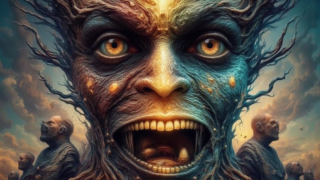 This image reveals hidden faces and figures within a surreal, dreamlike composition, created with intricate detail in a hyperrealistic style. It features unsettling, mutated facial features and fractal elements.