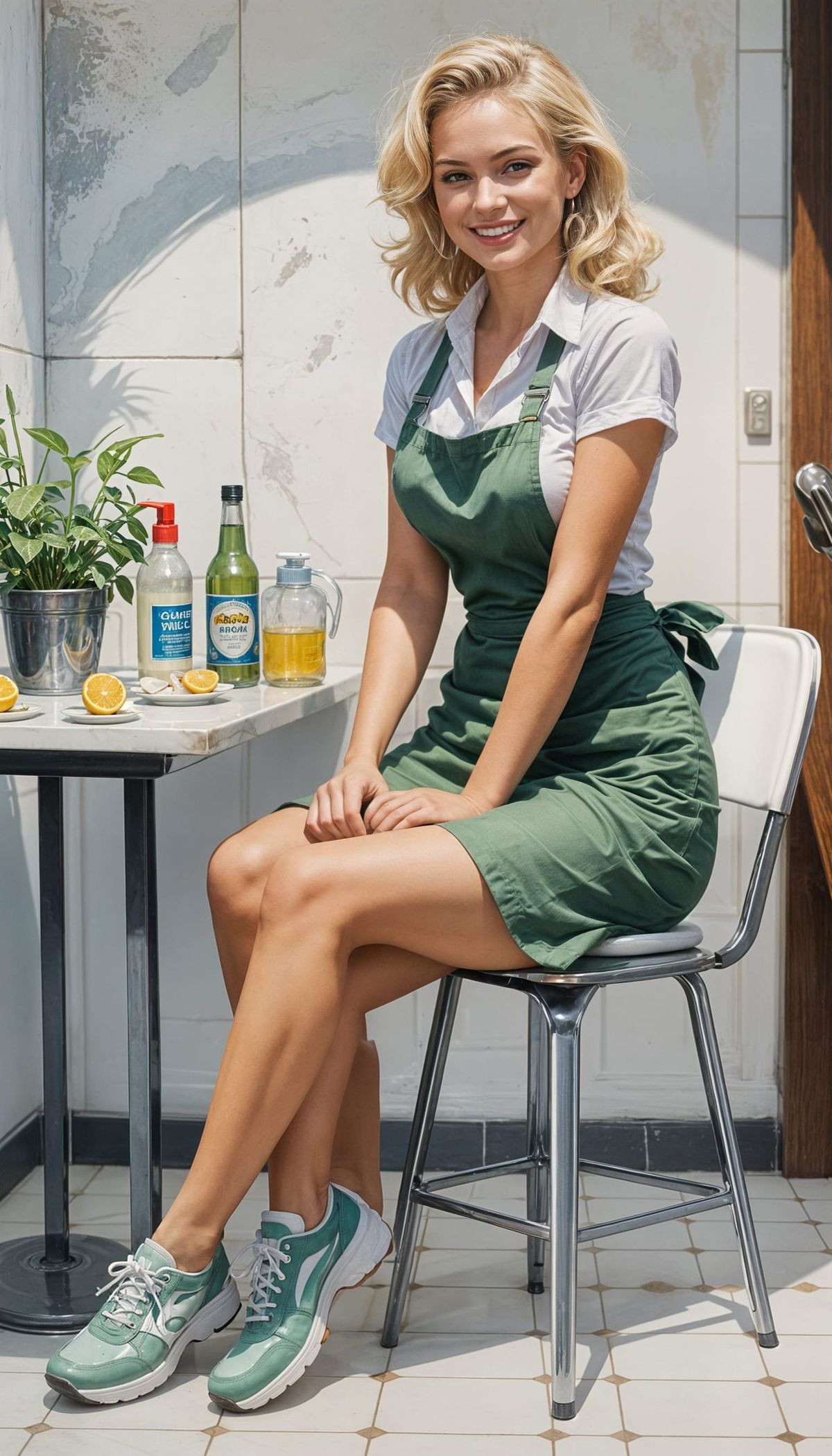 A vibrant image showing a busty blonde cleaning lady taking a break. Rendered with thick brushstrokes and textured gouache watercolors in an impressionistic style, the artwork captures a maximalist aesthetic.