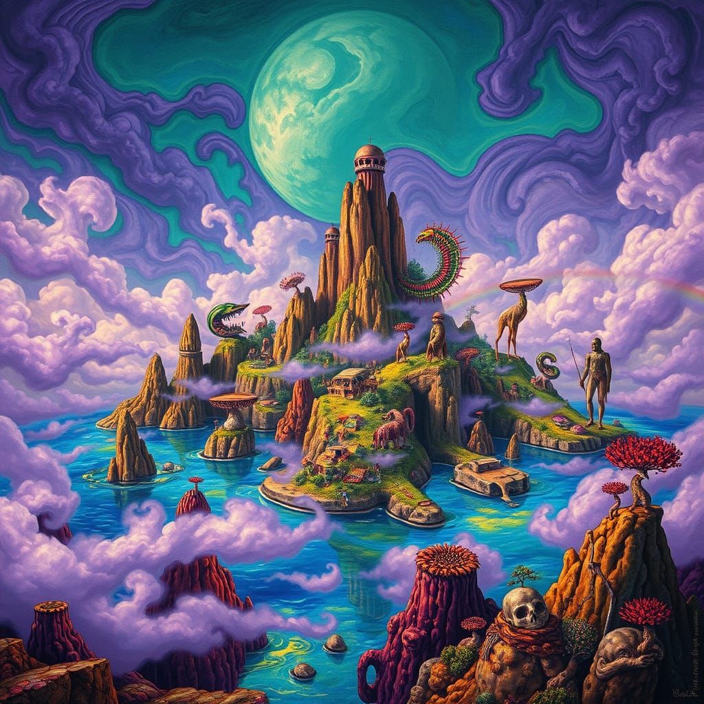 This surreal image depicts a vibrant, dreamlike archipelago teeming with fantastical creatures and hybrid beasts, reminiscent of Hieronymus Bosch's Netherlandish Renaissance masterpieces, blended with psychedelic patterns and colors.