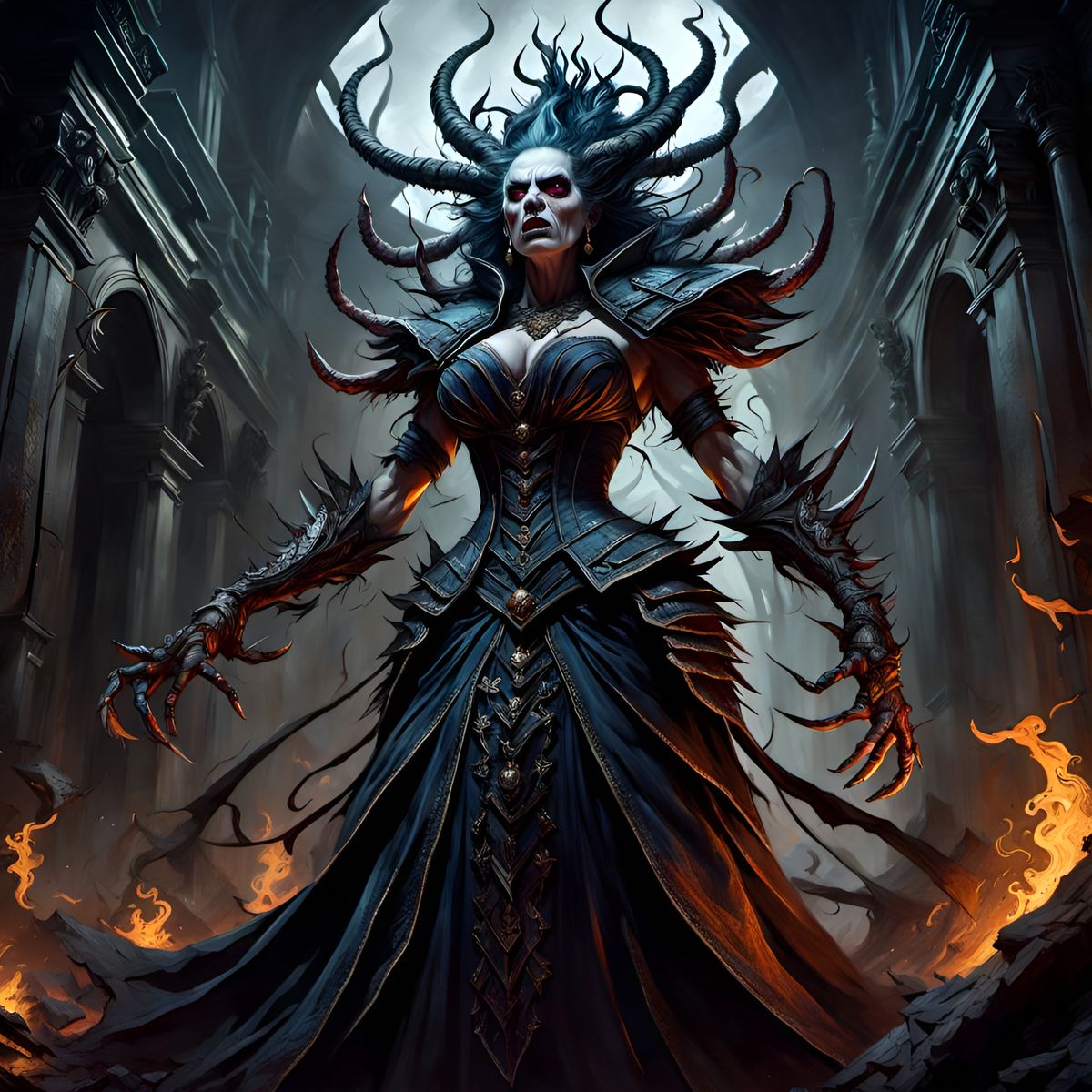 This image shows a furious, demonic female monster with elaborate attire. The digital illustration features dynamic lighting, cell-shading, and volumetric lighting in triadic colors, rendered in ultra-high resolution.