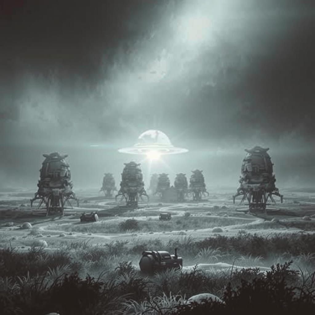This image shows a film set in the UK with a UFO prop being prepared for filming. The scene is dark and atmospheric, in the style of Gustave Doré and Greg Rutkowski.