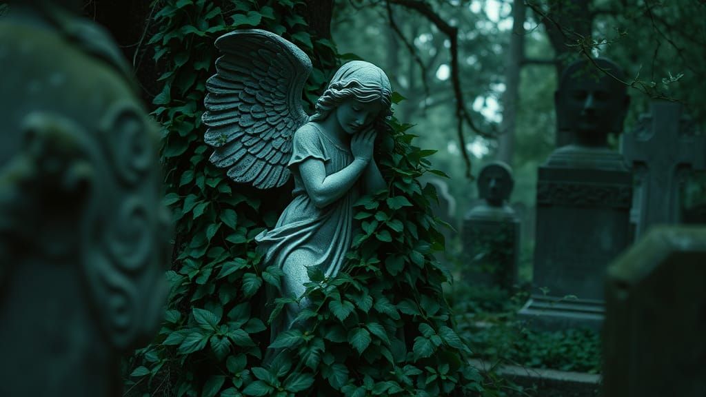 This image shows a weathered stone angel statue, partially obscured by ivy, residing in an overgrown and abandoned cemetery. The atmosphere is dark, moody, and mysterious, with film grain.