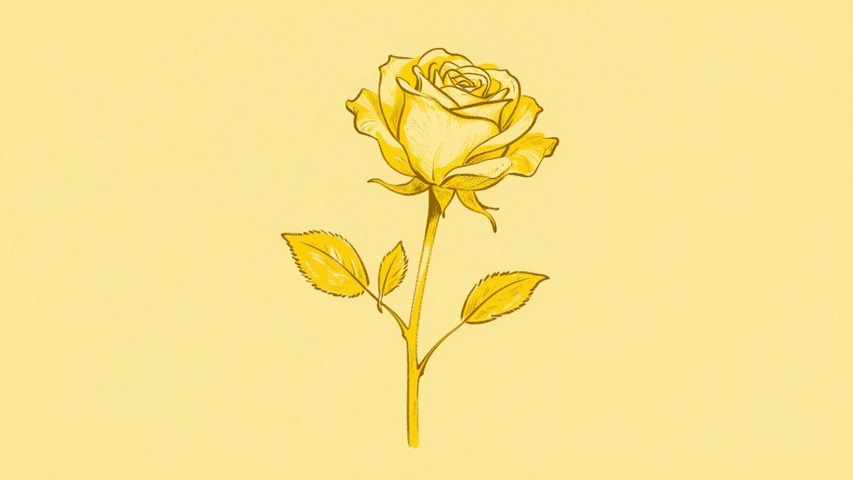This image presents a minimalist dry brush line drawing of a long-stemmed yellow rose. The artwork features a yellow background and a limited color palette focused on shades of yellow.