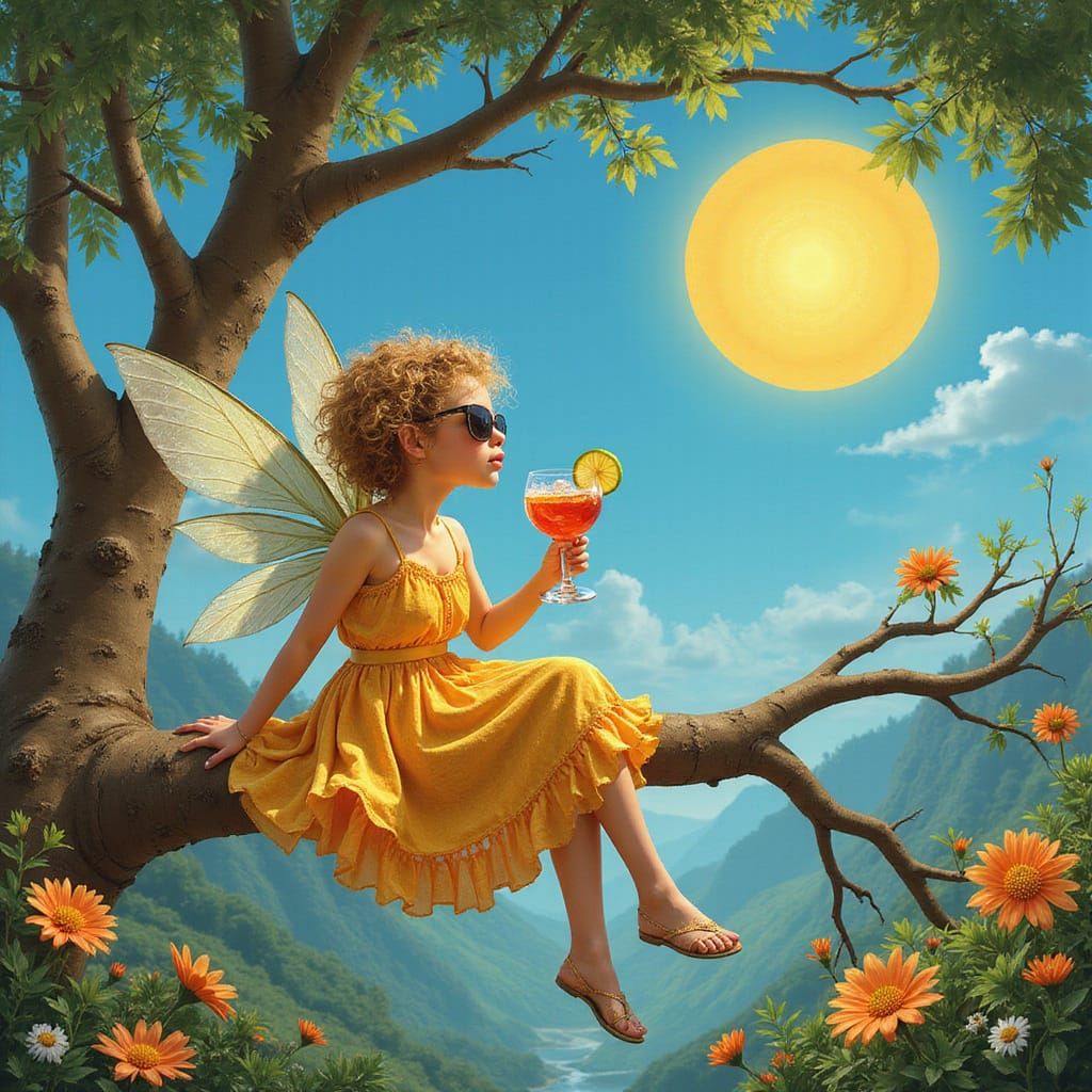 A colorful image of a fairy relaxing on a tree branch with a cocktail. The artwork features intricate botanical details and a whimsical feel in the style of art nouveau.