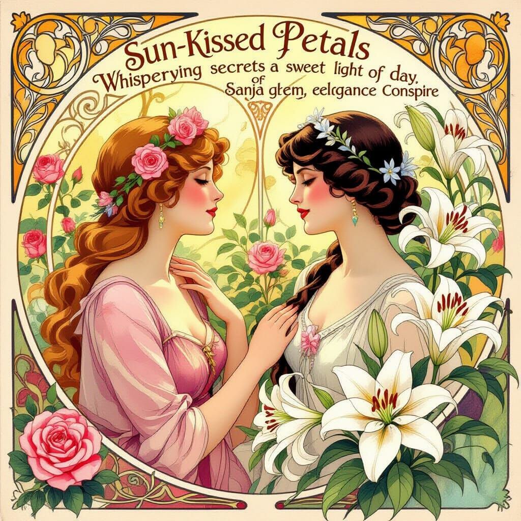 This image depicts a beautiful Art Nouveau scene with sun-kissed roses and lilies. The artwork captures a gentle, elegant atmosphere with a focus on floral beauty.
