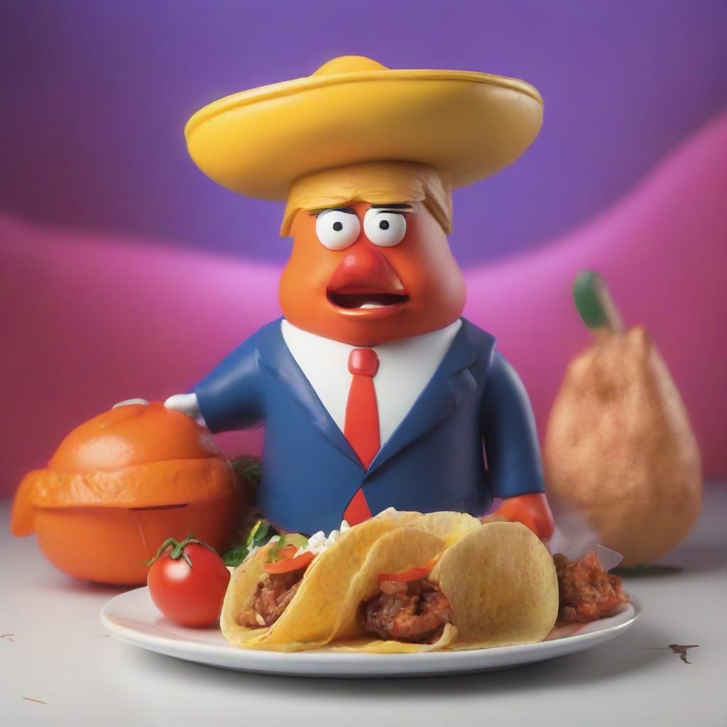 This image shows a caricature of Donald Trump as a taco chicken clown emperor. The image is rendered in the style of South Park, with cinematic lighting and film grain.