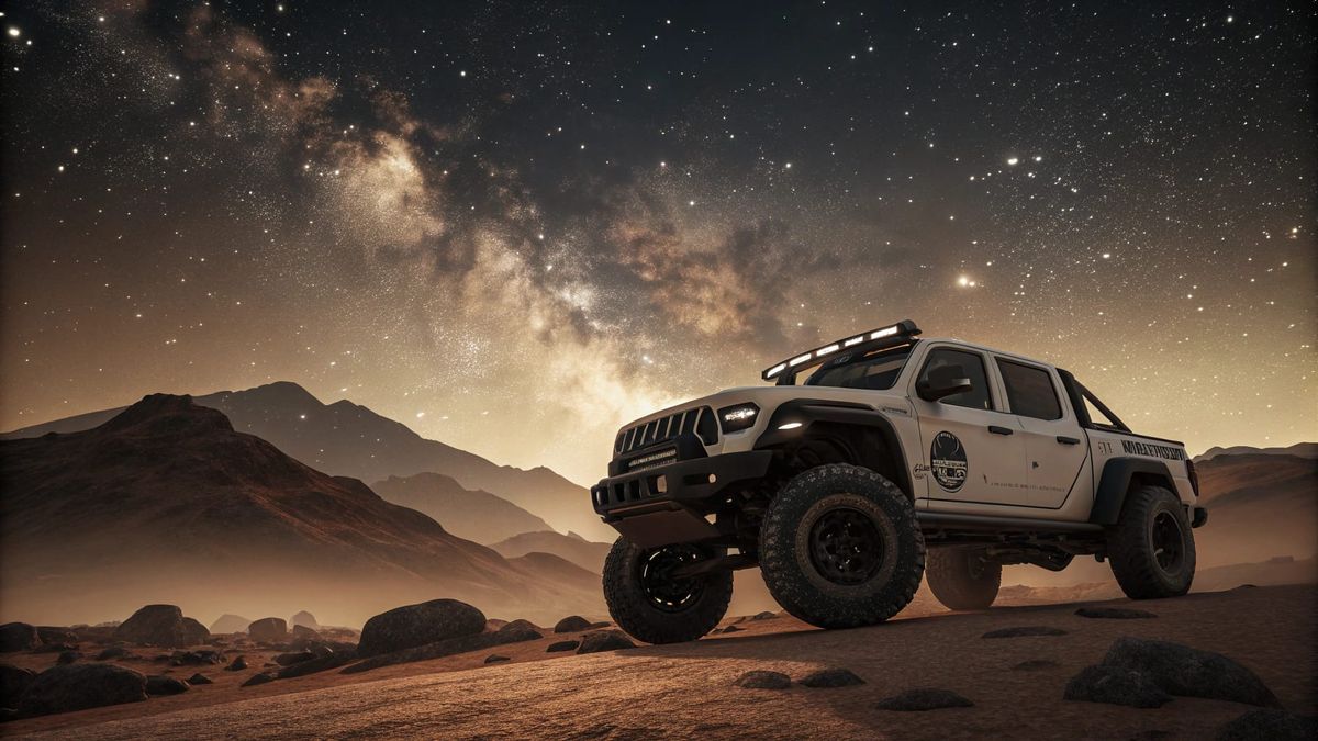 A rugged off-road truck parked on a dusty terrain, surrounded by a starry night sky and silhouetted mountains, evoking a sense of adventure and exploration with its warm, golden tones.