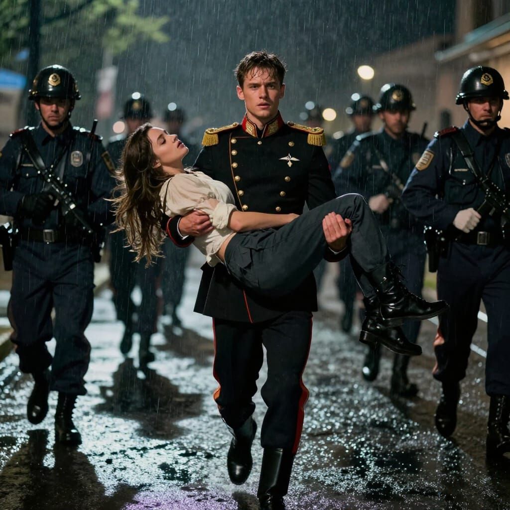 A striking image of a man in uniform carrying his girlfriend through a dark, wet street while pursued by a gang, with police support. Captured with cinematic lighting and film grain.