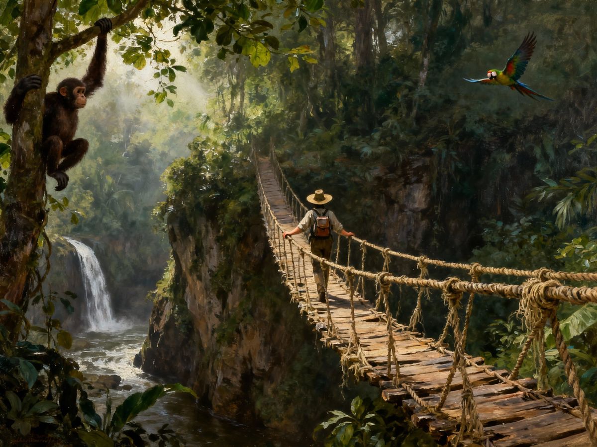 An old, hanging rope bridge over a cliff in a forest, as seen from someone about to cross over it. An ape hanging from a tree in the left edge, a Papagei flying in the far right background. A wanderer is halfway over the bridge, seen from behind, one hand on the railing, small backpack, broad hat. Oil-painted in the style of Rembrandt, Maria Sibylla Merian and John Atkinson Grimshaw.