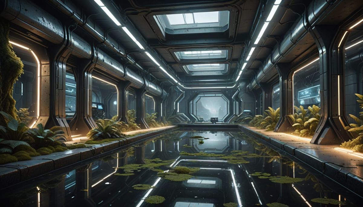 This image depicts a futuristic city's central hub interior. It features concrete blended with sandstone, crystal, and moss, with glowing bioluminescent water channels and a hovering AI bot, rendered in an ultra-realistic style.