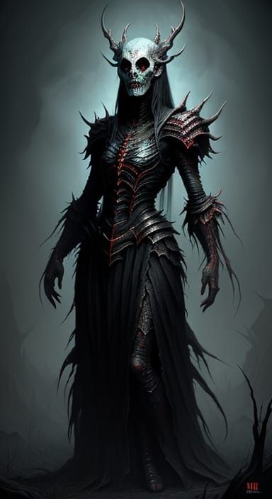 A hyper-detailed, full-body portrait of a fearsome female horror creature. This striking image features a dark, horror-themed color palette and an artistic style reminiscent of dark fantasy masters.