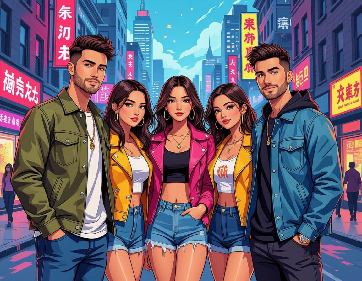 This image shows a group of seven people posing in front of a cityscape. The picture is styled with bold lines and vintage elements, with digital painting and watercolor textures.
