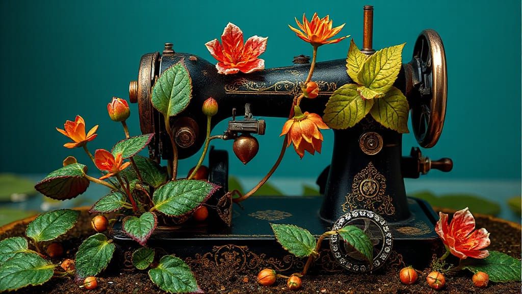 This image shows vibrant plants growing from an antique sewing machine. The piece features intricate, jeweled patterns and geometric arrangements, rendered with hyper-realistic textures in a teal and orange color scheme. The artwork has a cinematic, photorealistic style.