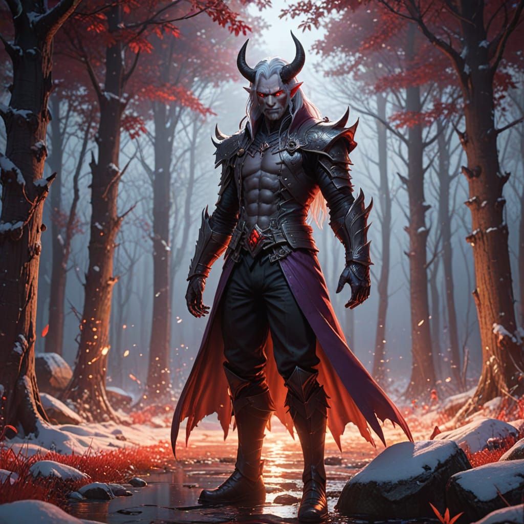 A close-up portrait of a male demon with plum-purple skin, neon-red eyes, and long snow-white hair blowing across his ruby-red garment. Dramatic lighting and intricate details create a breathtaking, anime-inspired scene.