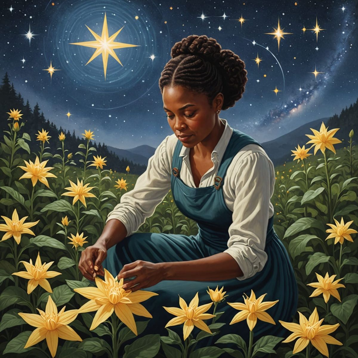 A whimsical image of a 'Star Gardner' tending celestial flora. The scene blends gardening with cosmic elements, creating a surreal and imaginative landscape.
