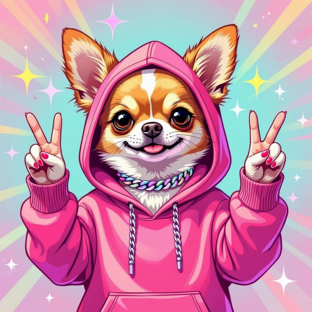 This image shows an adorable chihuahua wearing a pink hoodie and jewelry, giving a peace sign. The artwork features bold lines, vibrant colors, and textures reminiscent of pop art.