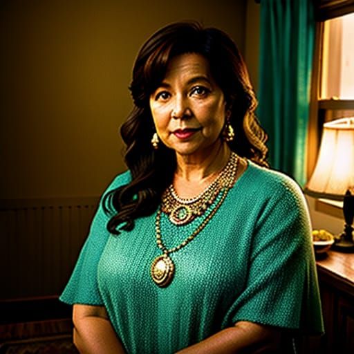 A medium shot portrait of Aunt Cass in a warm, inviting room. She wears a turquoise necklace that sparkles in the soft light, with a film grain aesthetic.