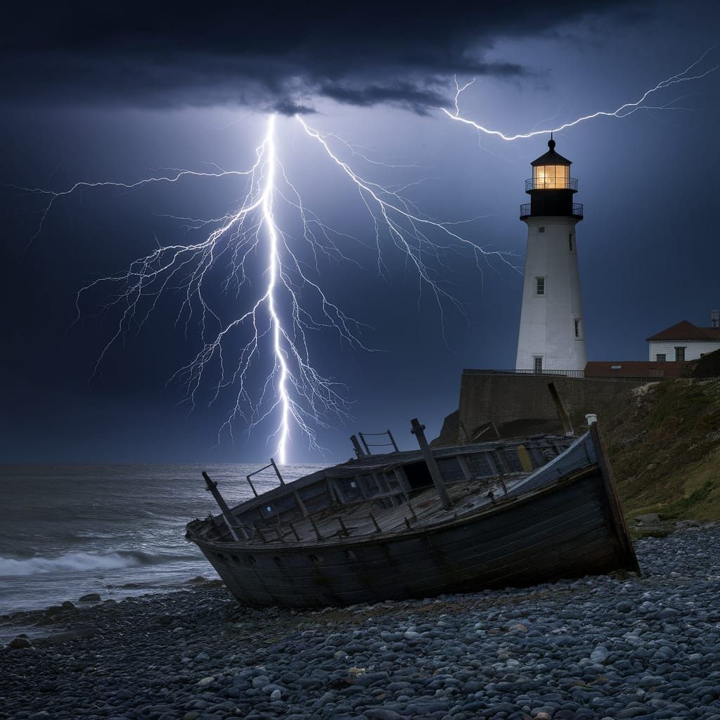 A dramatic nighttime seascape showing an extreme thunderstorm over a rocky beach. Lightning strikes a lighthouse while strong winds batter an old shipwreck on the shore.