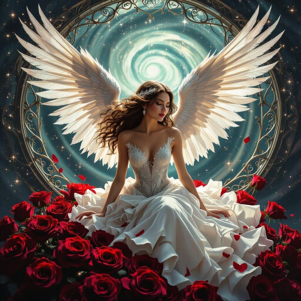 This image shows a beautiful girl with shimmering feather wings emerging from a bed of red roses against a swirling stardust vortex. The scene is highly realistic with dramatic lighting, highlighting intricate wing details and delicate petals.