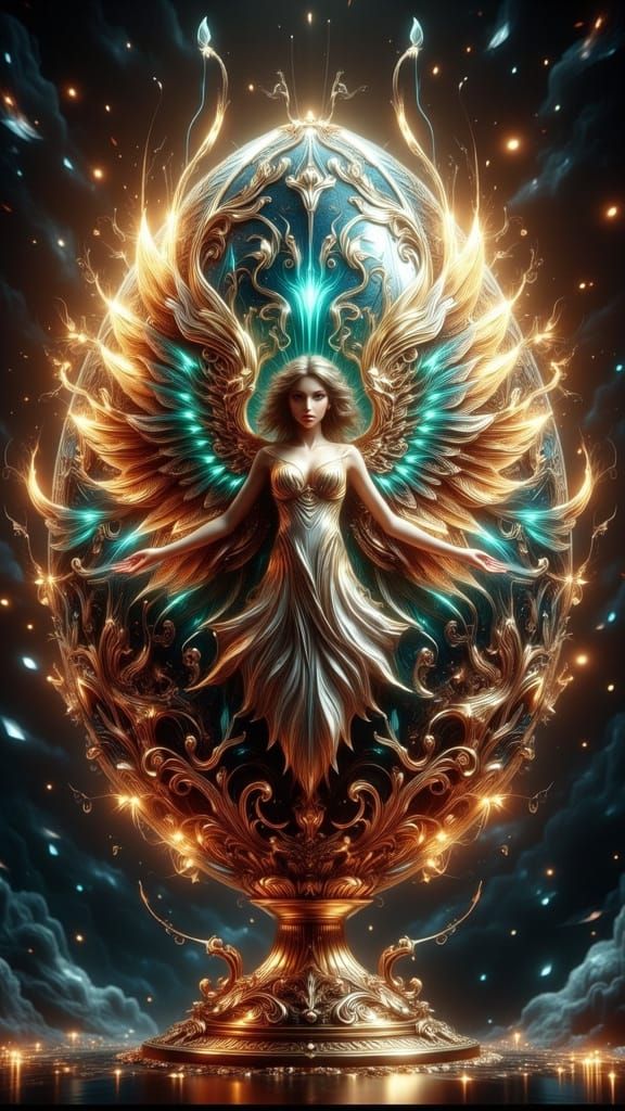 This hyperrealistic digital matte painting showcases an ornate Faberge egg featuring a celestial goddess with intricate wings and glistening colors. The artwork boasts a 3D effect and maximalist composition, rendered in 8k resolution with a holographic finish.