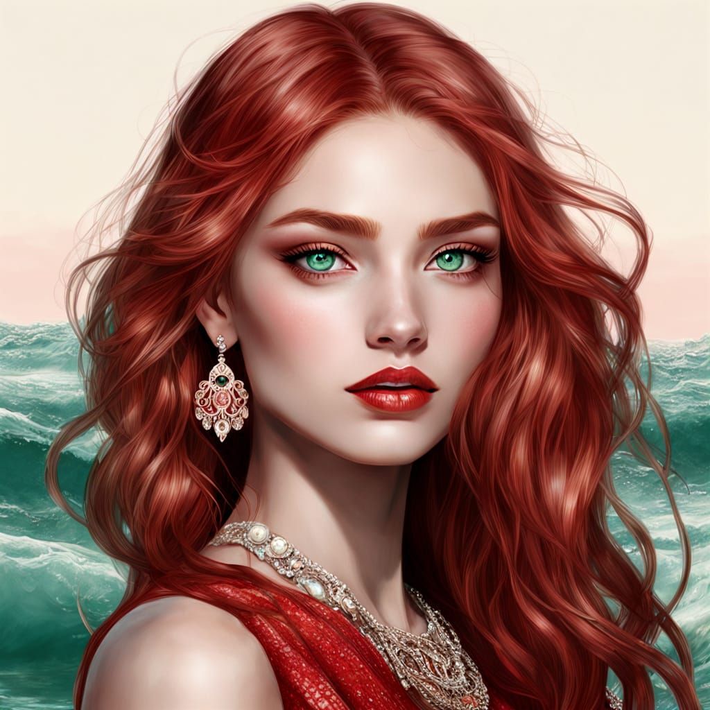 This image showcases a stunning Indian woman with a fairie chic aesthetic, featuring soft, gorgeous features, pale strawberry blonde hair, and striking green eyes. Her smooth, amber skin and lush lips exude a sense of glamour and beauty.