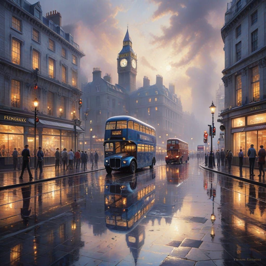 This image shows a vibrant summer street scene in London's Piccadilly, with reflections shimmering on the wet pavement. The artwork evokes an ethereal, hyperdetailed fantasy aesthetic.
