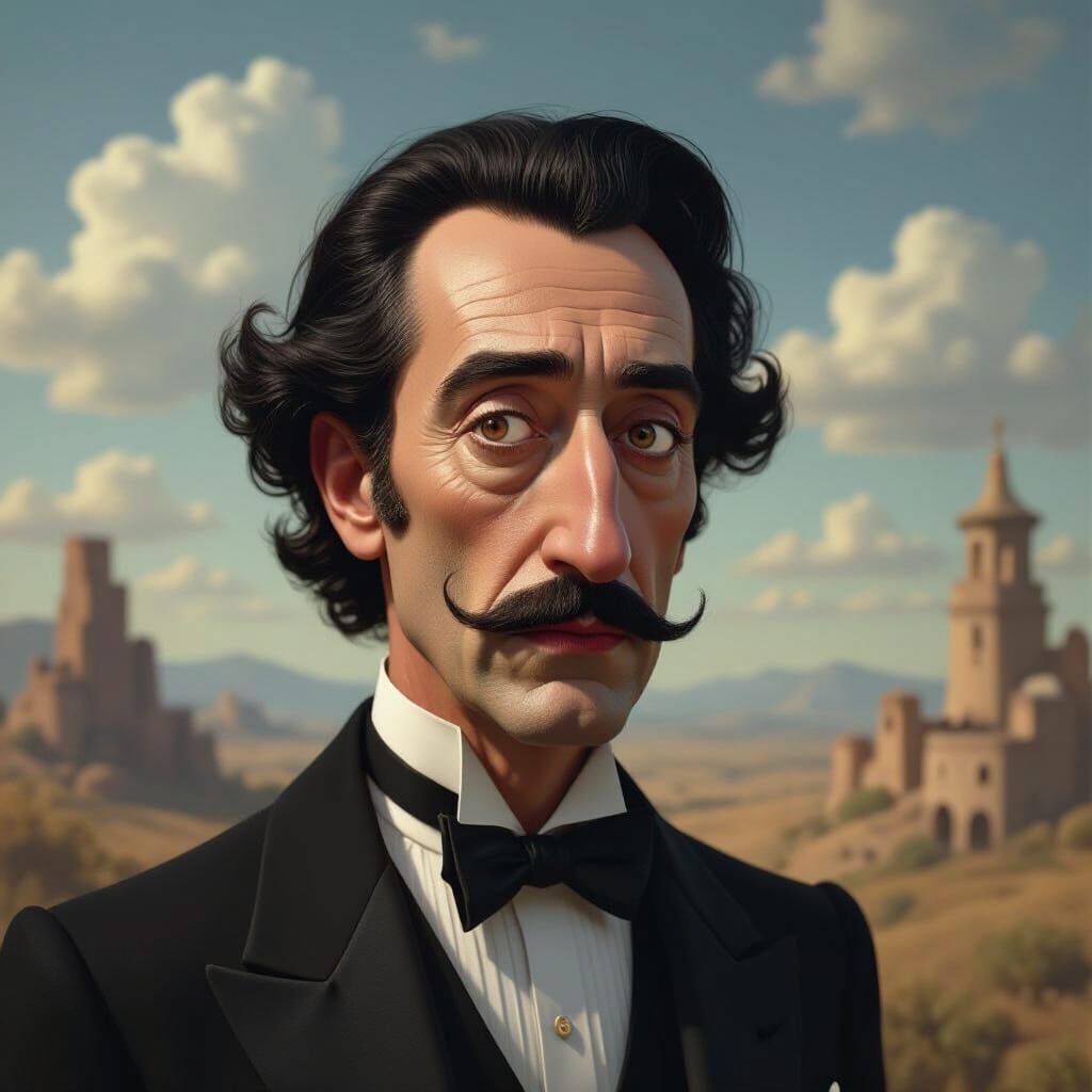 This image presents a thought-provoking, hyperrealistic portrait with a surreal and eccentric aesthetic, evoking the distinctive styles of Salvador Dali and Tim Burton.