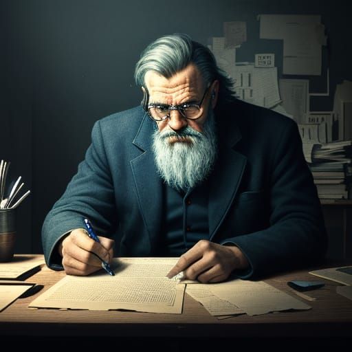 A disheveled poet sits at a desk, surrounded by papers and quills, rewriting literature in a world of gritty realism and high contrast lighting.