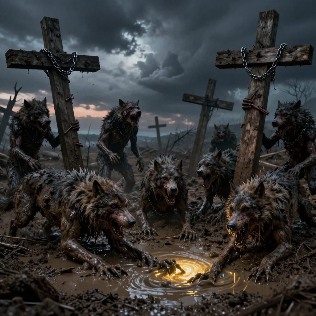 A hyperrealistic, macabre scene featuring chained werewolves on wooden crosses in a muddy wasteland under a stormy twilight sky. Dramatic lighting emphasizes creature details and atmosphere in a dark fantasy concept art style.