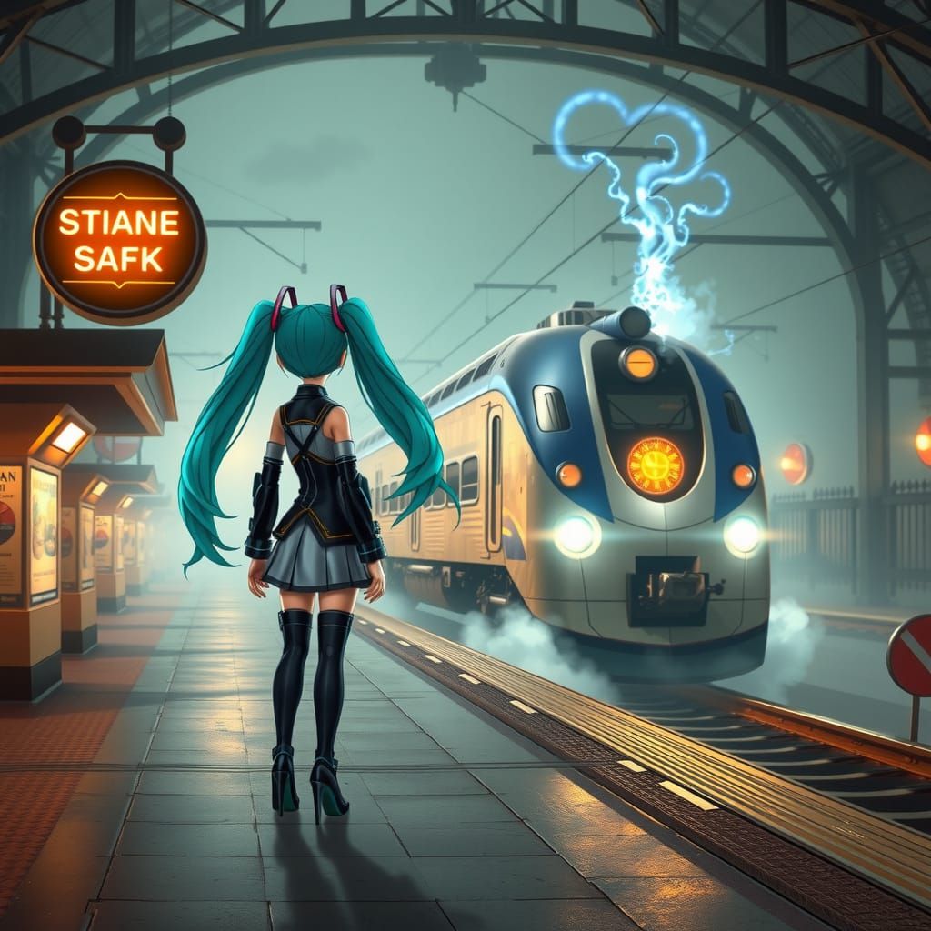 At a train station, a retro-futuristic bullet train with magnetic suspension and dieselpunk aesthetics is arriving. Hatsune Miku waits at the station and watches alone as the train arrives.