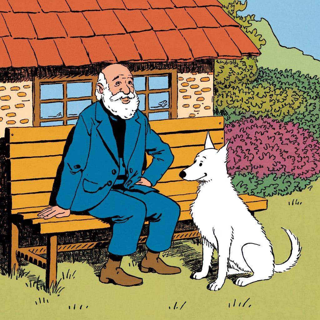 A poignant pen and ink illustration of Tintin as an elderly gentleman enjoying a serene moment with his loyal companion Snowy outside a charming cottage, rendered in a stunning color palette reminiscent of classic comic art.