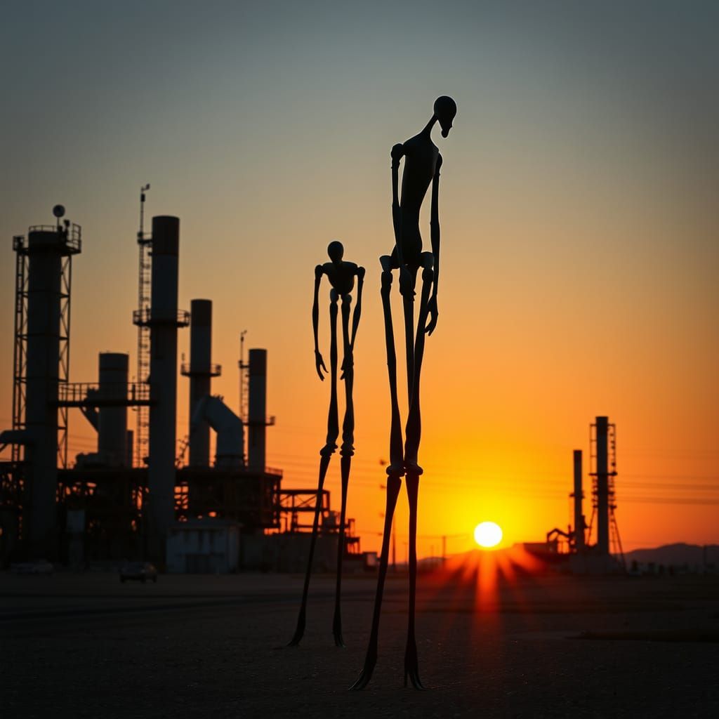 This image shows towering stilt walkers in the style of a cinematic, atmospheric sculpture, set against a backdrop of an old oil refinery at sunset, with intricate details and high contrast.
