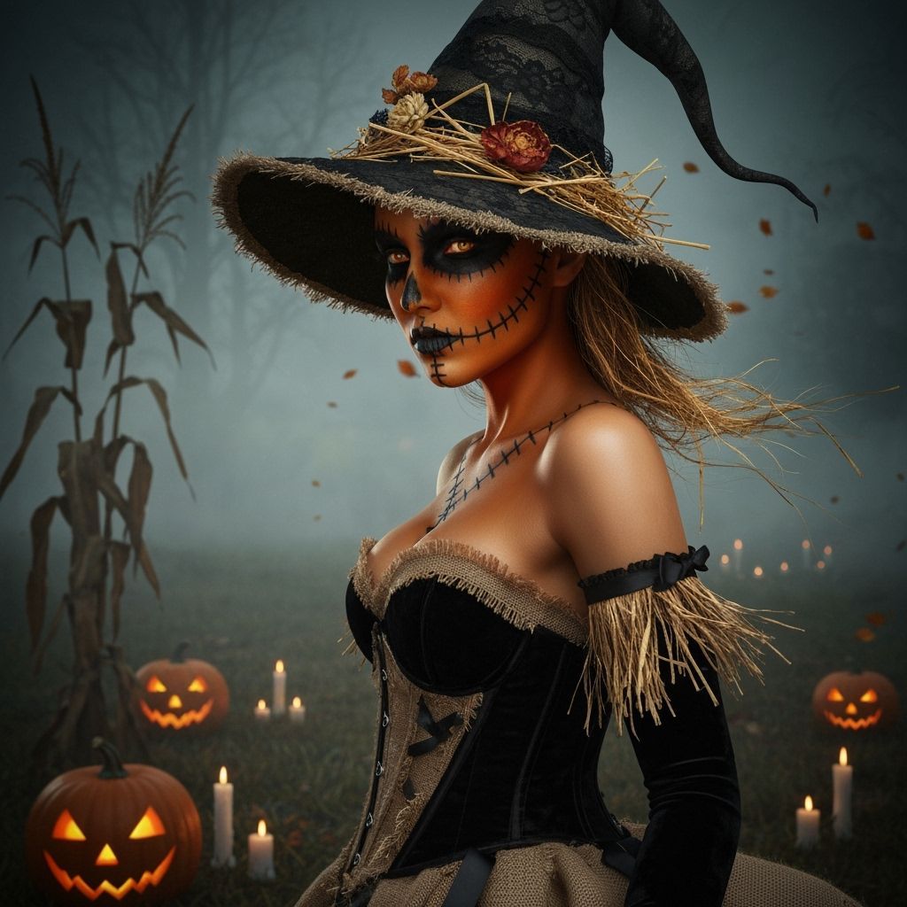 This image features a stunning woman with elegant scarecrow makeup in a haute couture Halloween fashion style. Cinematic lighting highlights her unique look and gothic attire.