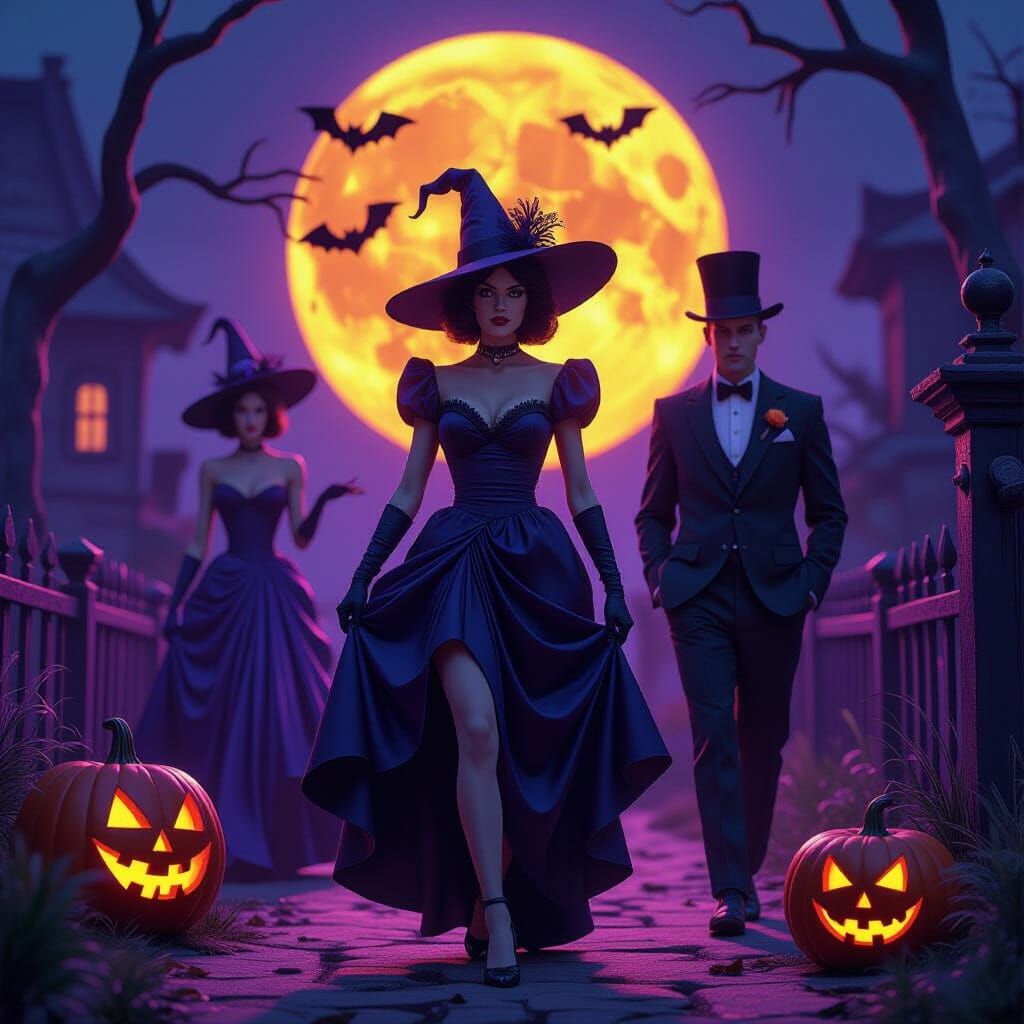 A dark fantasy concept art masterpiece depicting a 1950s adult Halloween party. Features hyperdetailed visuals, deep colors, and volumetric lighting in purple and yellow.