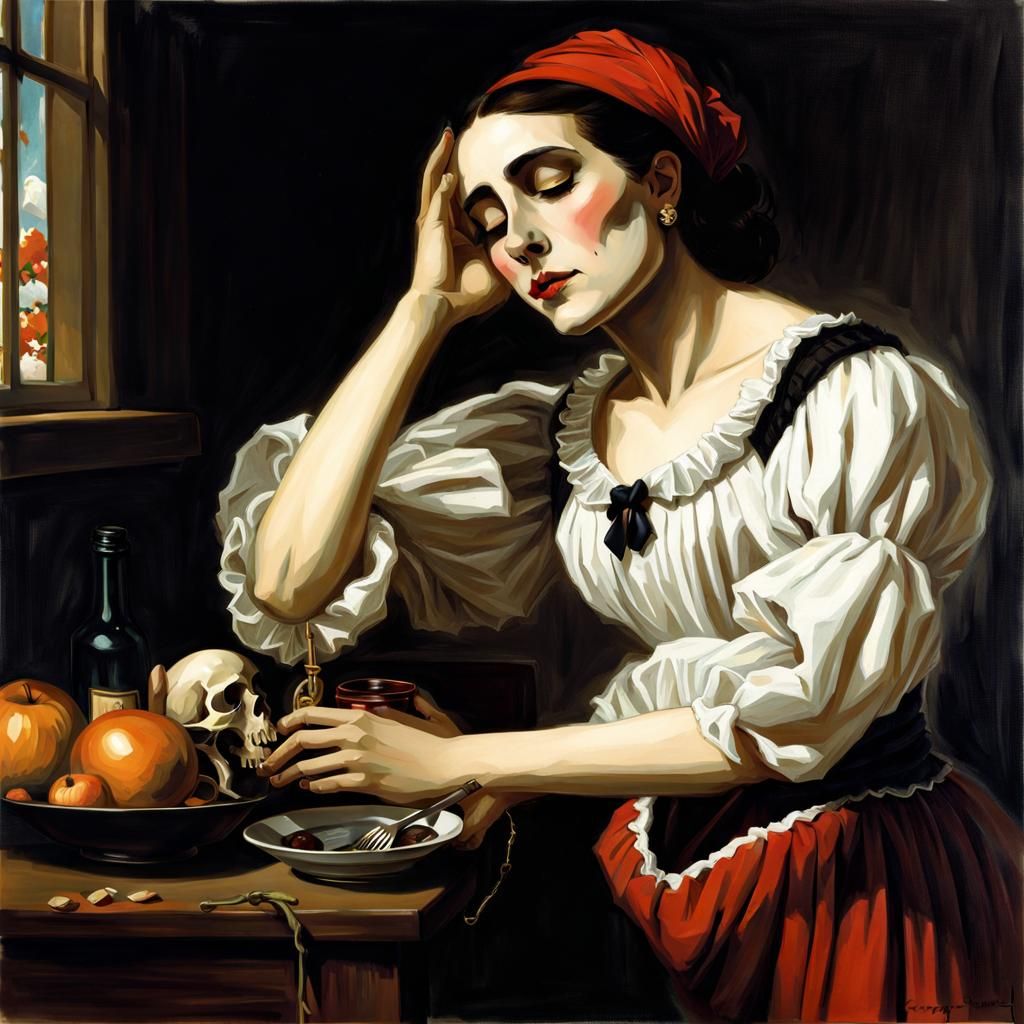 This image shows a skeletal military figure embodying sorrow. The somber depiction explores themes of loss and existential despair in a stark, evocative manner.