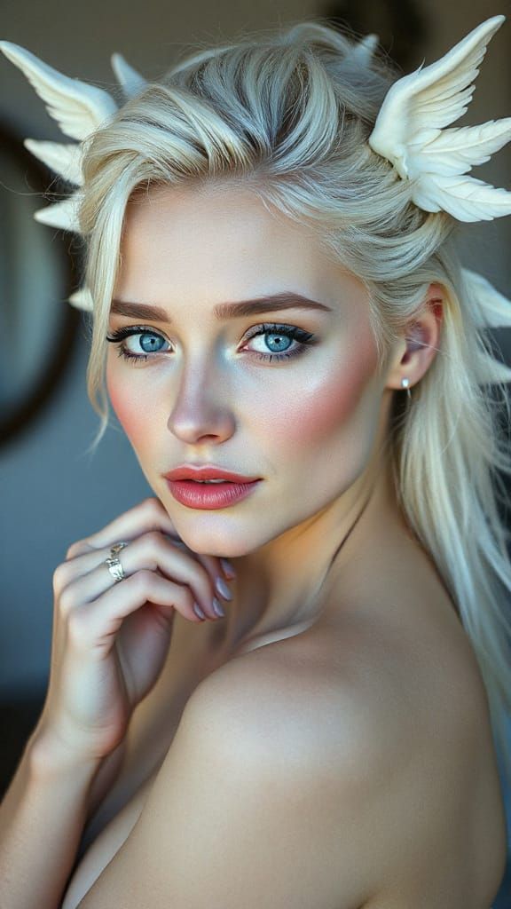 This image features a serene portrait of celestial beauty with pale, flawless skin and striking blue eyes. The aesthetic blends surrealism and photography, captured with a 35mm film look and HDR detail.